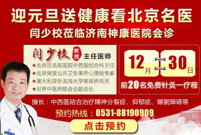 对于久治不愈的精神疾病患者来说,济南神康医院专家团队正在借助“京沪鲁精神科名医会诊平台”,向疑难精神疾病患者抛出了多学科专家团队的橄榄枝,京沪鲁专家的强强联合,也增强了患者的治疗信心。元旦来临,为了解决广大患者“看病难,看名医更难”的问题,2017年12月30日,济南神康医院再次特邀闻名全国的北京精神科名医闫少校来院亲诊,满足患者的就诊需求。预约前20名患者还可享受免费针灸一疗程的优惠待遇,机会难得,欢迎广大患者提前预约报名。