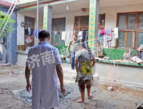 一进家门,院子里堆了水泥沙子,房顶上有工人在施工。